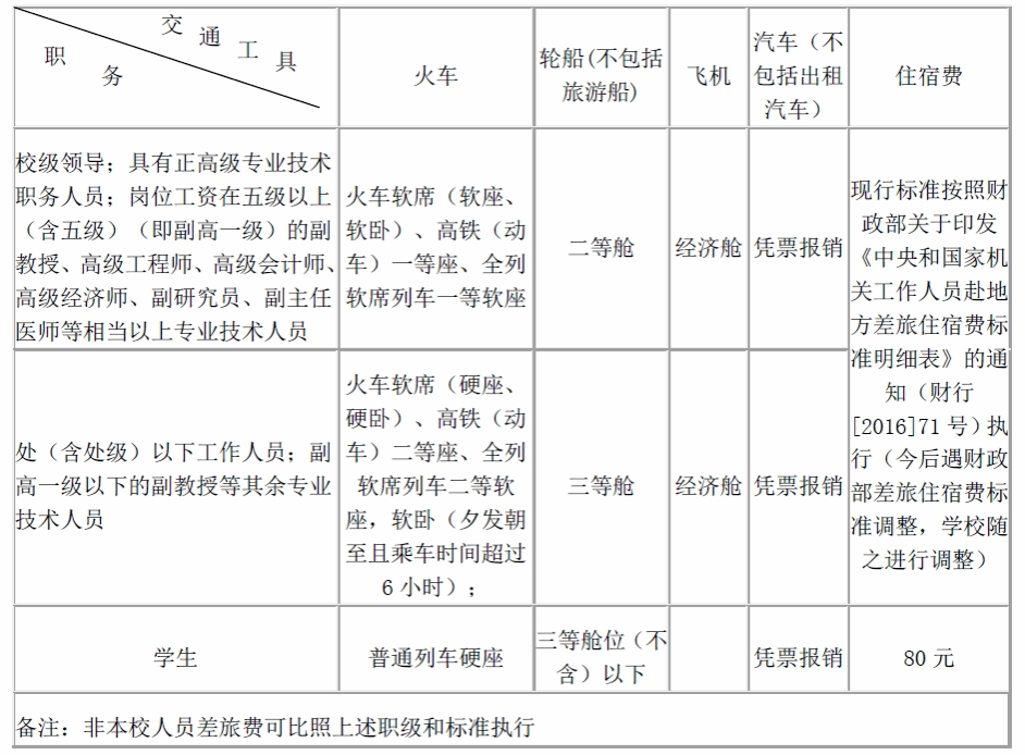 第七条 到出差目的地有多种交通工具可选择时,教职工应在不影响公务、确保安全的前提下,选乘经济便捷的交通工具。教职工出差可住单间或标准间,并在对应的住宿费标准限额内,选择安全、经济、便捷的宾馆住宿。