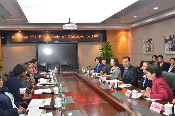 Invited by All-China Women’s Federation (ACWF), the First Lady of Zimbabwe Grace Mugabe, accompanied by officials from Zimbabwe Women’s Federation, visited China Women’s University (CWU) on October 21.