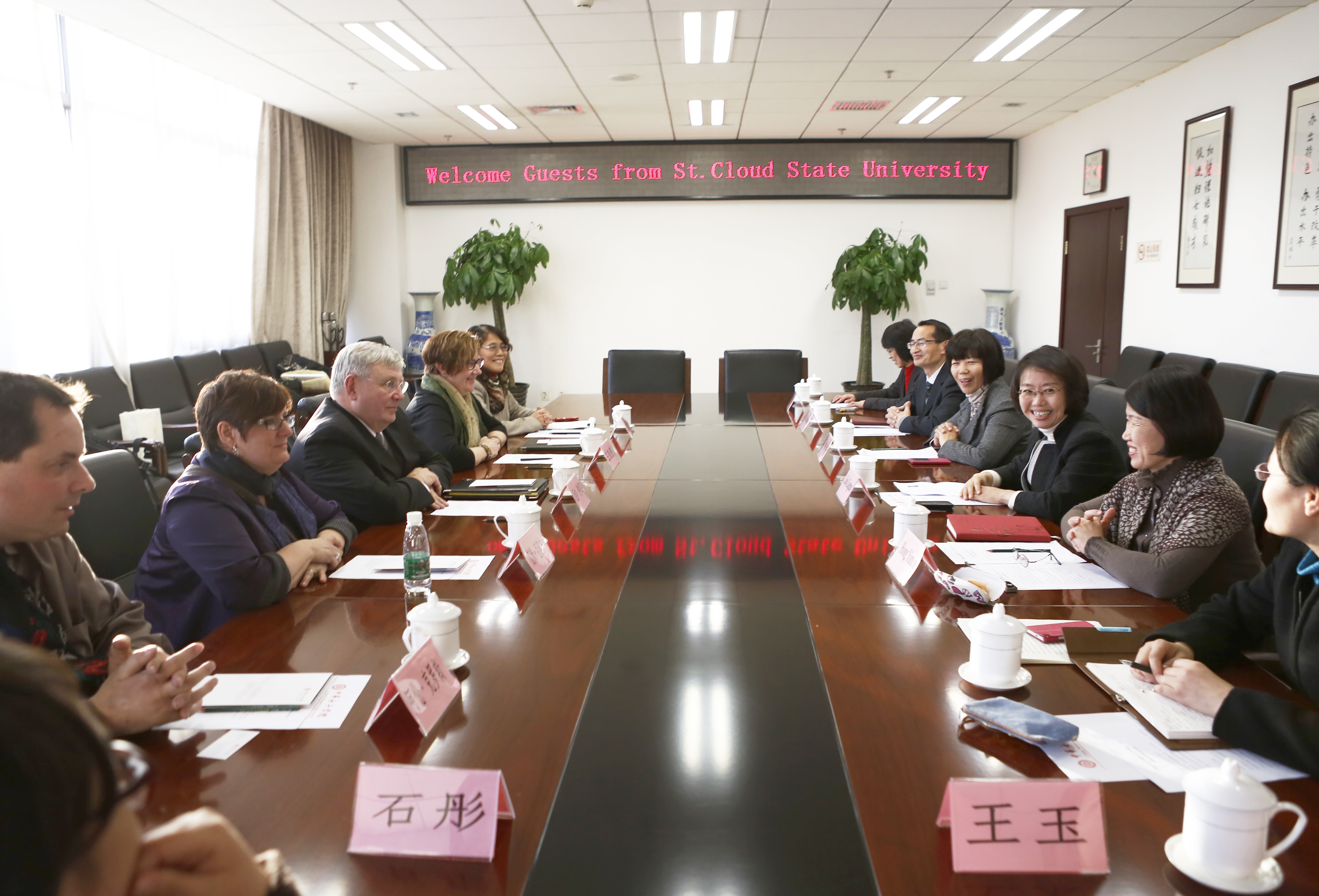Professor Liu Liqun, President of China Women's University (CWU), met with visiting president of St. Cloud State University (SCSU), Earl H. Potter III, on December 12, 2014.