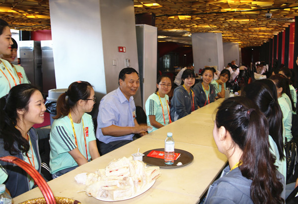 A total of 158 studentsfrom China Women’s University (CWU) took part as 118 ushers and 40 volunteers in the 15th IAAF World Championships held in Beijing from August 22-30. To motivate the students and further inspire them to work harder, Li Mingshun, chairperson of CWU Council, accompanied by CWU Secretary of the Youth League Committee Zhang Ruizhi and other teachers in charge, paid them regular visits.