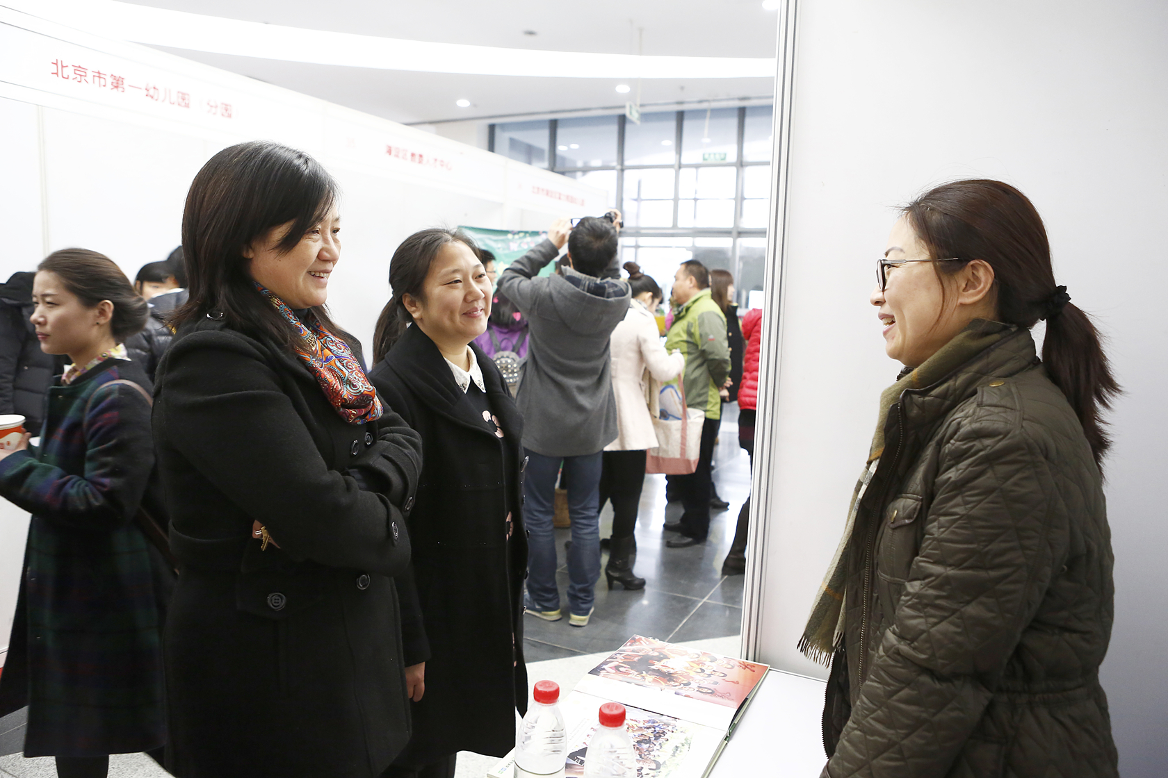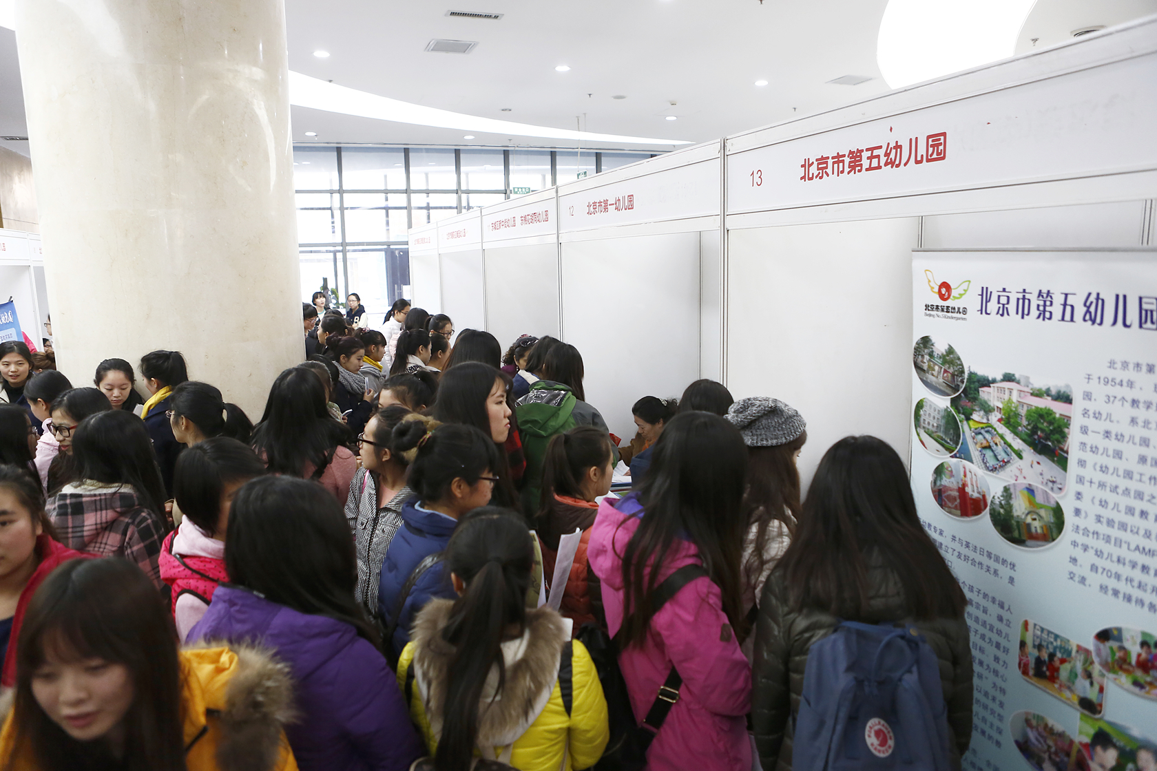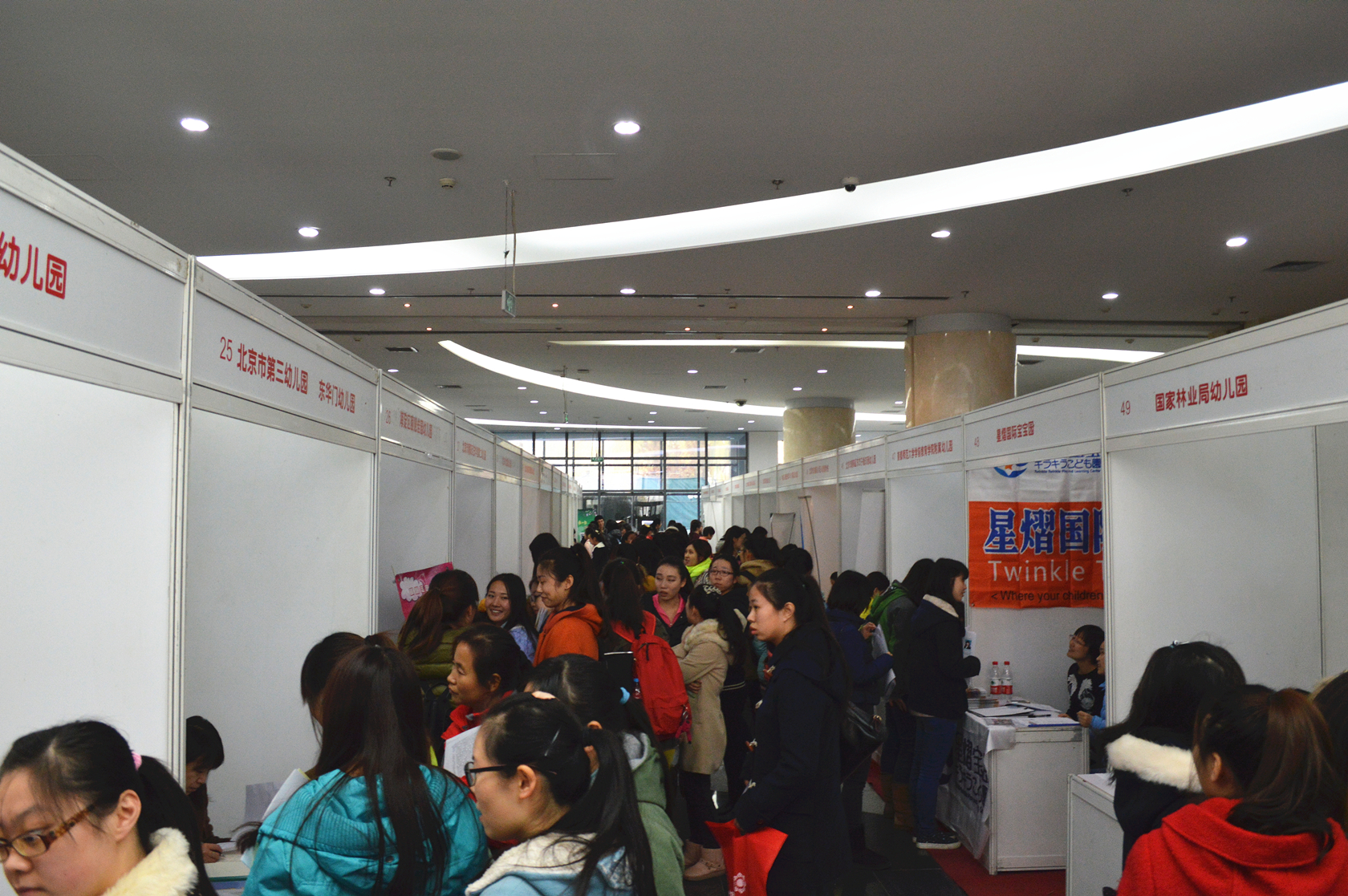 2014年11月25日下午,2015届学前教育专业专场招聘会在学校教学图书综合楼一层大厅顺利举行,来自北京各区县的65家单位参加了此场招聘会,其中包括公立幼儿园36家、私立幼儿园以及部分早教机构29家,共提供就业岗位500余个。儿童发展与教育学院、高职学院400名学前教育专业本、专科毕业生前往招聘会现场,踊跃向用人单位自荐,会场气氛热烈,供需两旺。bwin必赢中国官网副院长宋胜菊亲临现场,与用人单位亲切交谈;儿童发展与教育学院党总支书记赵伟、以及学院的老师们也都前往招聘会现场,了解用人单位对毕业生的需求情况并积极向用人单位推荐毕业生。