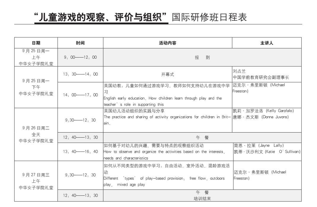 为促进我院科研与教学水平的提升,推动专业交流与合作,中国学前教育研究会特别邀请英国幼教联盟质量改进部门主管、英国幼教质量及工作质改专家小组成员,迈克尔·阿德里安·弗里斯顿(Michael Adrian Freeston),和拥有丰富理论与实践研究经验的凯莉·加罗法洛(Kelly Garofalo)、唐娜·杰文斯(Donna Juvons)等五位英国学前教育专家,结合《英国早期儿童基础教育指南》分析探讨儿童有效学习的特征、结合《英国早期儿童基础教育指南》分析讲解儿童游戏的观察与评价、结合儿童游戏的视频案例深入探讨儿童如何通过游戏学习、结合英国实际活动讲解教师如何支持儿童在游戏中学习与发展,于2017年9月25-27日(周一—周三)在必赢官网礼堂举办讲座活动。欢迎我院师生参加。有意参加的同学请以班级为单位,于9月22日(周五)15:00前到主楼211-1办公室王璐老师处领取入场券。