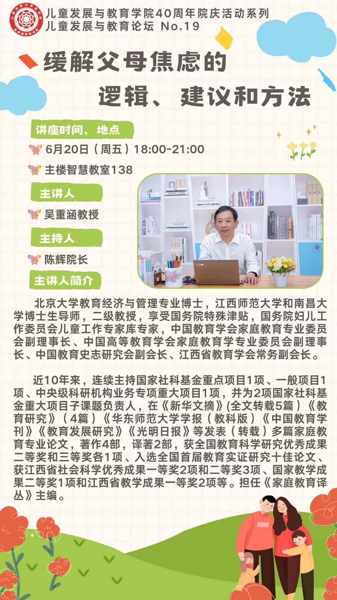 儿童发展与教育学院40周年院庆活动系列儿童发展与教育论坛 No.19:缓解父母焦虑的逻辑、建议和方法