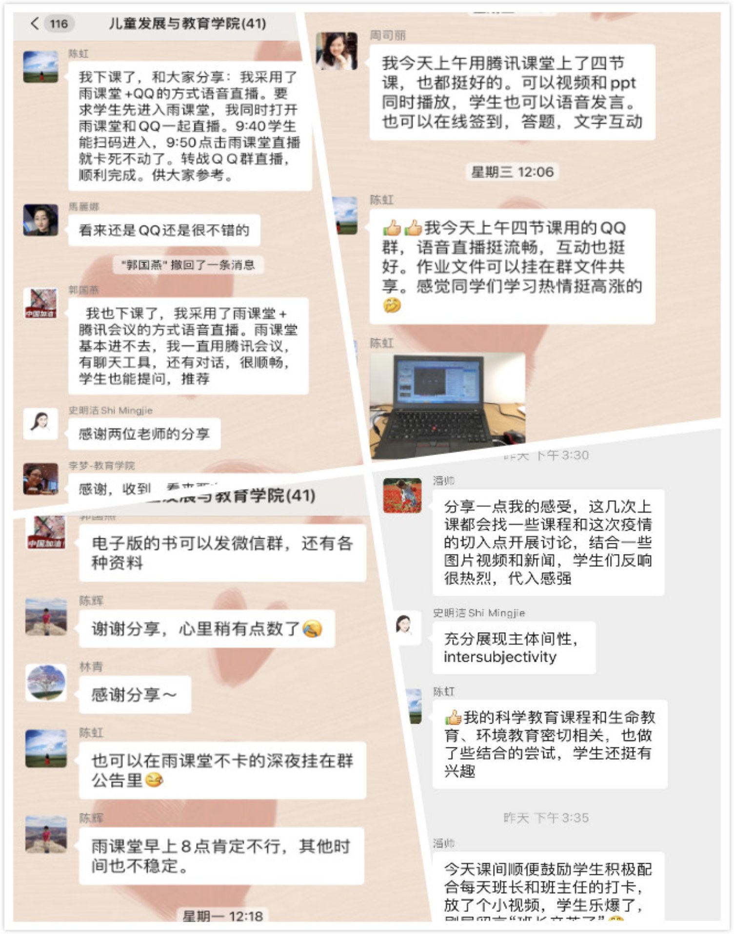 在线课程一结束,老师们都会第一时间在学院微信群分享上课情况、经验、问题以及初战告捷的激动,给还未开始线上直播的老师极大地信心和鼓舞。大家在一起探讨线上平台的使用技巧,师生互动的方法,共享在直播过程中的感受、经验和学生的积极反馈。老师们还结合自己的课程和学生讨论与疫情相关的问题,在教学中渗透生命教育和环境教育,给学生积极正确的价值引导。每一天都有新的经验、新的交流,新的反思和想法的碰撞,大家共同探索,相互支持,讨论空前热烈,形成了持续不断、全天候的在线教学研讨活动。