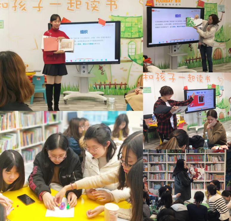 参观活动分为上午和下午两个部分。上午的活动在悠贝公共事业部刘佳兰老师对悠贝品牌和图书馆的介绍中展开。通过刘老师的介绍,学生们了解了社区图书馆的发展历程、馆内环境、图书摆设、常规性的故事会等绘本阅读活动,以及已经开展的各项特色阅读活动。随后,学生们还有幸观摩了馆长周虹老师为孩子和家长们组织的故事会—2-4岁幼儿绘本阅读活动。通过此次观摩,学生们对于绘本活动的组织、绘本阅读的流程和领读绘本的技巧有了更加直观地感受和了解。