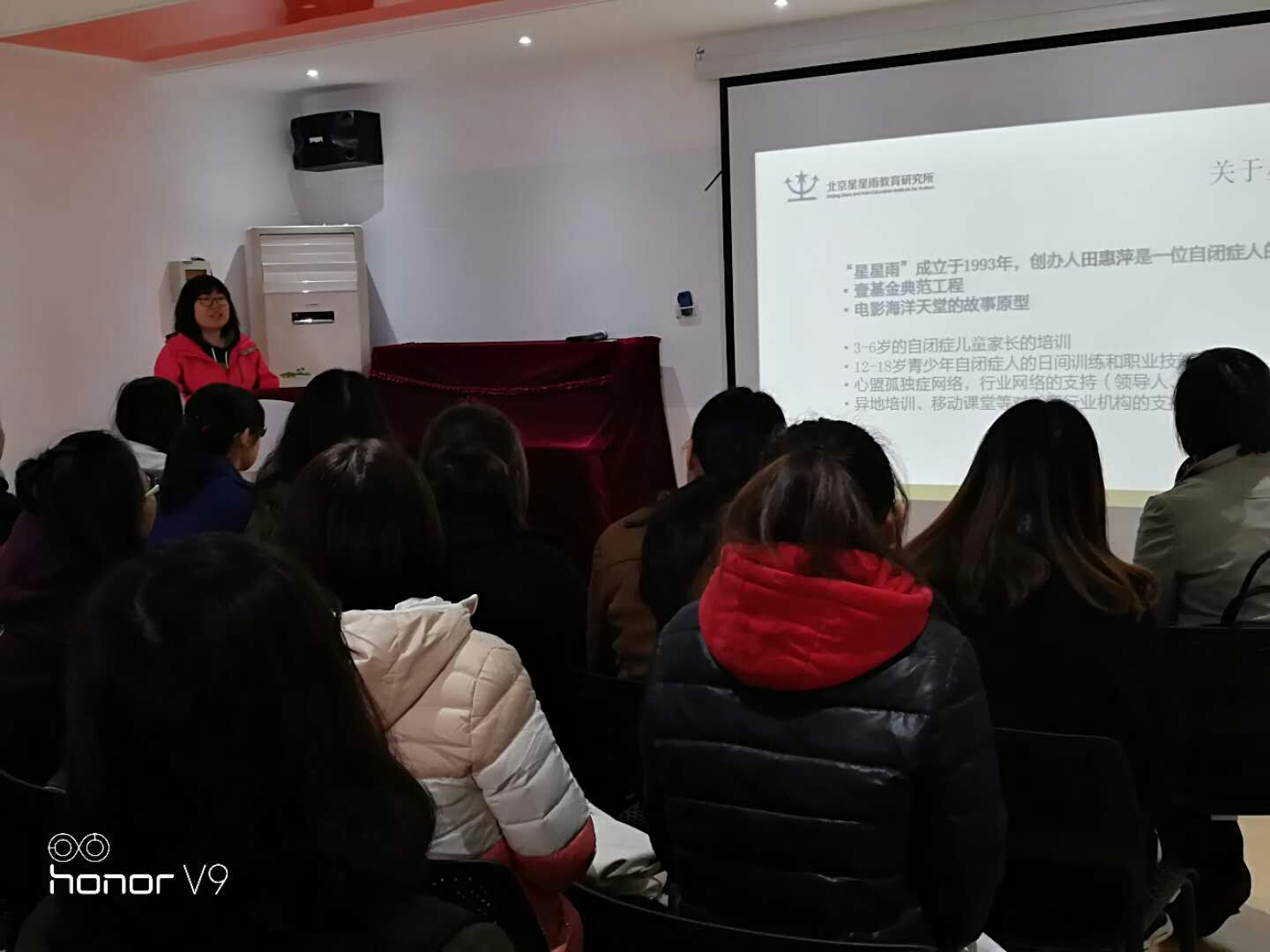 星星雨的李翔老师对同学们进行了热情接待,首先带领师生了解了学校的布局,随后,李老师带领大家来到了教师培训室以PPT以及视频的方式对星星雨、自闭症以及志愿工作做了一个较为详细的介绍。同学们了解到:北京星星雨教育研究所是以提供专业技术培训为核心的机构,以提升家长对孤独症儿童的养育能力并促进行业的健康发展为自己的使命。 星星雨是我国第一家为孤独症儿童及其家庭提供服务的民办非营利机构,从1993年开始已为3000多个孤独症儿童及其家庭提供过服务。星星雨还开发出了一套家长训练模式,在这里,来自全国各地的孤独症的家长们要接受3个月的课程,以便他们能够用教育自己的孩子。在中国只有这种模式是可行的,因为回到自己的家乡后,这样的家庭得不到类似的服务,因此这些家长必须自己承担起训练和教育孩子的责任。