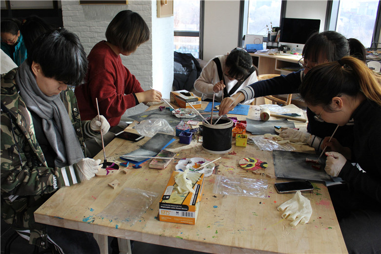 同学们对活动中心进行了简单参观后,体验了木艺和扎染艺术。扎染活动中,老师介绍了扎染的取材,通过对染草、花果、茶叶等几十多种植物染料的了解,夹撷、绞撷、灰撷等传统技术手段的运用,融合天然染料的地域性和民族性特点,让大家感受到古人物尽其用的智慧,同学们亲自动手制作,体验了扎染的全过程。木艺工坊让同学们了解了中国传统木结构技艺榫卯结构,在给定的木制零件上经过吸铁石的拼接,可以把它变成想要的样子,经过绘画的点缀,勾勒成属于自己的脸谱。