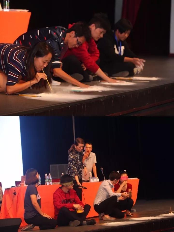短暂的休息之后,下午的研讨会掀起了全场互动的高潮,简恩老师邀请志愿者现场玩面粉、蒙眼摸蛋液和蛋壳,并采访志愿者的想法和感受。随后播放了幼儿园中孩子玩面粉、人体彩绘、雨中踩水的视频,孩子们自由的、充满想象力的玩法让会场笑声连连。前后的对比,也让我们更好地理解孩子的游戏,理解孩子,帮助我们更好地站在孩子的角度来考虑问题。