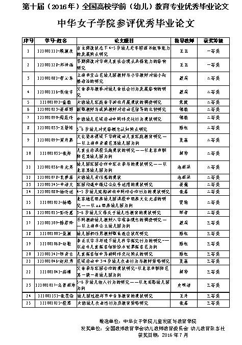2016届学前教育专业毕业论文获全国高校学前教育专业优秀毕业论文奖