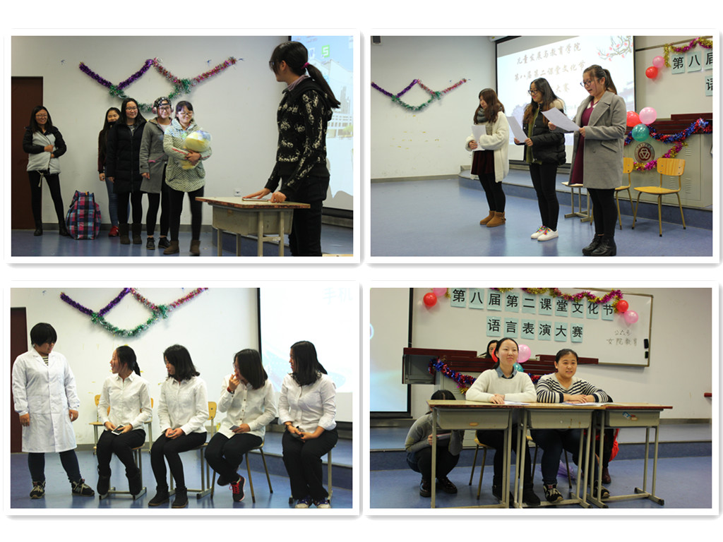 为丰富校园文化生活,增强学生团队合作意识,充分展现我院学生积极向上的精神风貌,儿童发展与教育学院于11月20日在教图楼315举办了第八届第二课堂文化节之语言表演大赛。