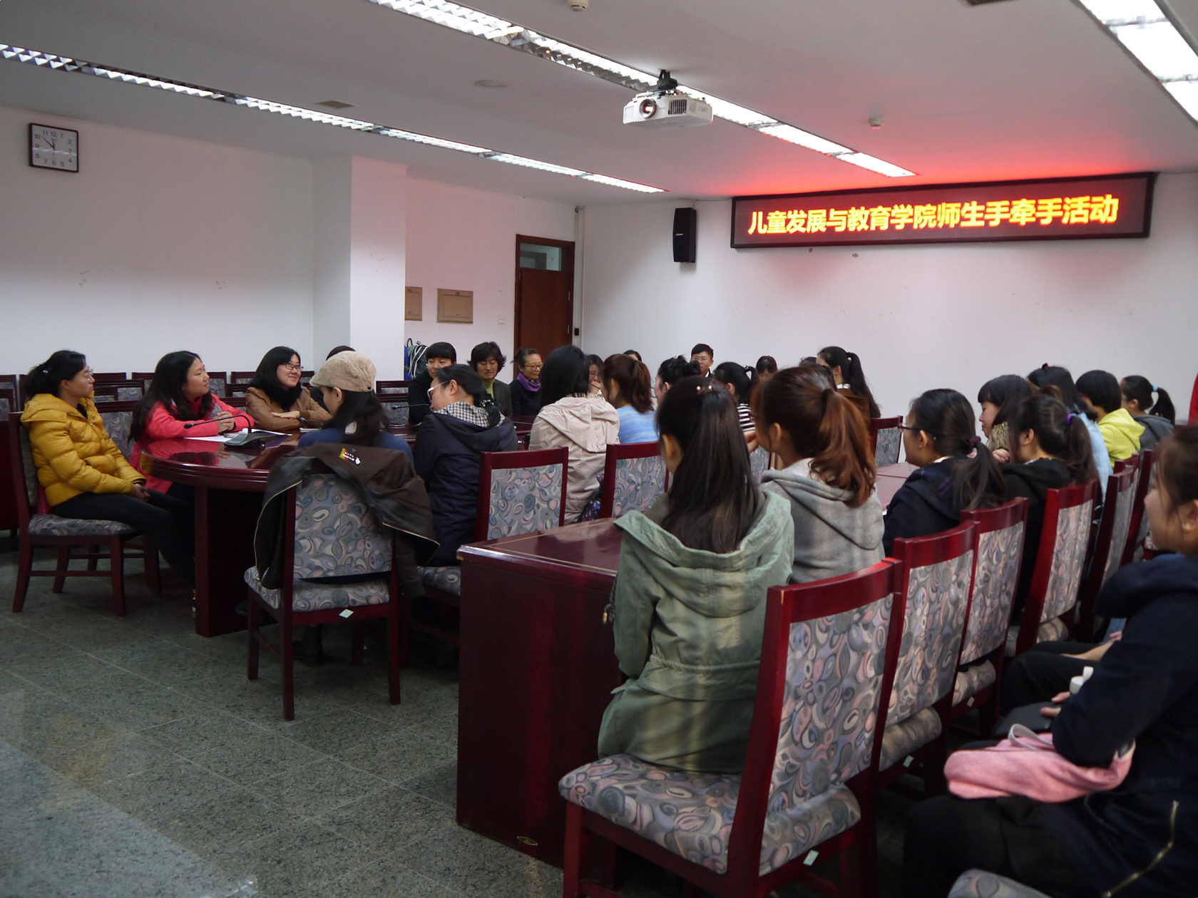 为进一步加强基层党组织与群众的联系,更好地帮助和促进学生的成长成才,儿童发展与教育学院教工党支部积极落实学校党委关于师生手牵手活动的相关要求,与2013级学前教育4班开展师生手牵手活动,在前期精心策划的基础上,11月3日中午,儿童发展与教育学院教工党支部与2013级学前教育4班在学校第七会议室举办了师生座谈交流会。
