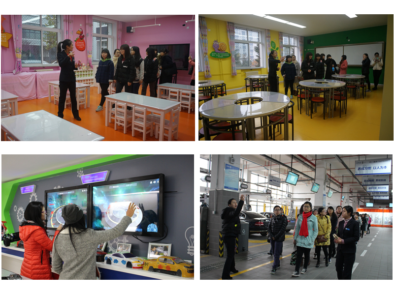 踏进校门,职业学校的“厚德、励学、自强、竞业”的校训吸引了同学们的注意,校园干净的环境、整齐的布局也让同学们留下了深刻的印象,体现了这所学校“把细节做成极致,把简单做出完美”的理念。同学们在昌平职业学校老师的引领下,先后参观了学校的校史馆、航空楼、综合实训楼、中德汽车教育文化交流中心、汽车科普体验中心以及学前楼,同学们赞叹于这些场所先进的教学设施和规范的教学管理。在学前楼,“塑幼师形象,修内在含韵”的理念,让同学们默默吟念,美工室、口语室、声乐室、保育室、舞蹈实训室、早教实训室、模拟教学实训室等教学场所,以其逼真现场融入感,也让同学们感慨阵阵。2012级学前教育专业的袁梦淼感慨道:“这是我感触最大的地方,每个职业都是需要丰富的实践经验来不断地使自己更加进步……知识的储备固然重要,但是没有在现实生活中进行论证,那么它们也不会是真理。”