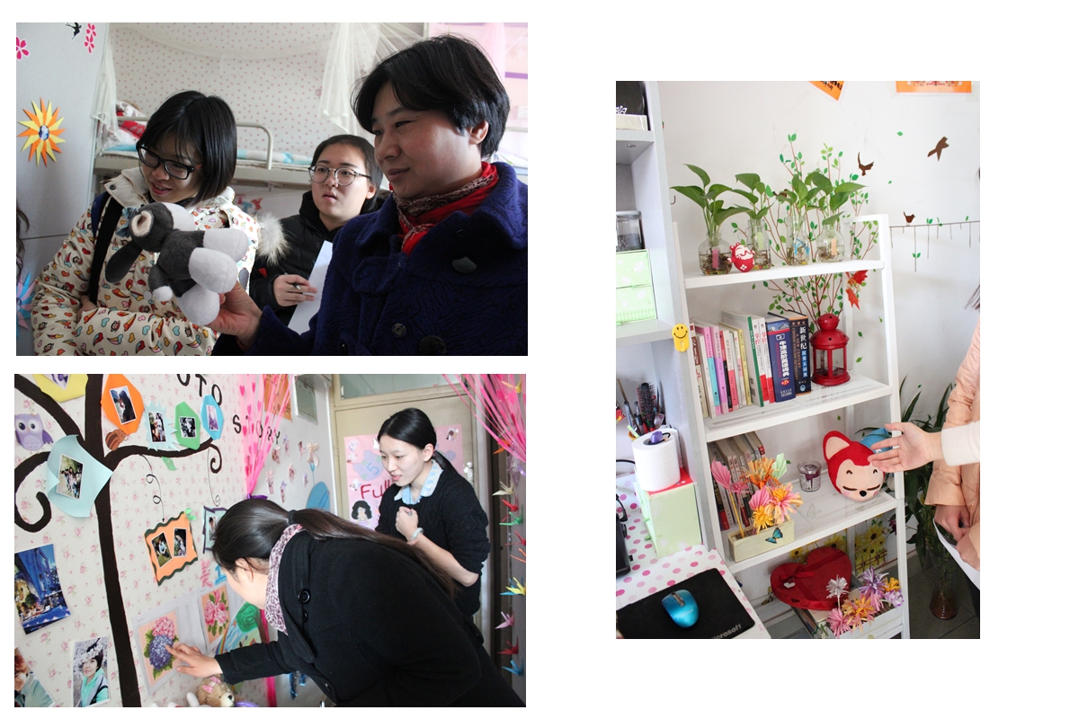 宿舍环境的参观评比于12月1日中午进行,以现场评分的形式开展。为保证结果的公平公正,检查工作小组成员由团学成员、班级生活委员和宿舍长组成,分为两组分别为12级、13级的学生宿舍评分。儿童发展与教育学院巫晓莲老师、龙春芳老师、杨多老师以及学校后勤处老师作为此次评选嘉宾出席。评比于中午12:10分准时开始,各参赛宿舍调动积极性,充分诠释了什么是“没有最美只有更美”,有的宿舍以绿色环保为主题,宿舍中所有装饰物的资费都由回收空瓶子筹得;有的宿舍弥漫着墨香,宿舍墙上挂着宿舍成员的书法作品;还有宿舍的橱柜上摆满了自己缝制的手工玩偶,将幼儿园的环境布置成了宿舍小天地。本次宿舍文化节中展示的宿舍成员照片墙、精美的海报、手工小饰物,都体现出了宿舍成员的友情和团结,让人眼前一亮。老师们肯定了所有参赛宿舍成员的努力成果,并说:“宿舍环境装扮发挥了学前教育专业的特长,将幼儿园的布置特色带入了宿舍中。一个干净和温馨的宿舍让处在其中的人感到心情愉悦。”