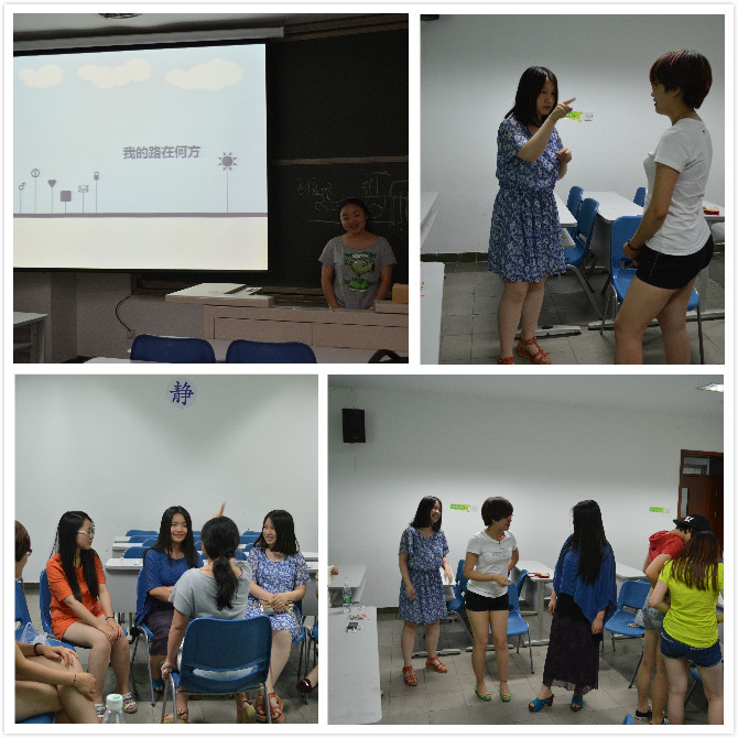 心理沙龙一开始,同学们就“路在何方”这一主题进行了分享,并开展了心理游戏,游戏中失败的同学在众人鼓励下展示舞蹈等才艺,虽然开始时彼此并不熟悉,但是气氛很快就火热起来,趁着大家都愉快地打开了心扉,我们的团体辅导开始了。我们就“用一个物体形容自己”这一主题进行延伸,每个人在分享了“自己是什么”之后,其他人都会描述自己对这一物体的感受,在这个过程中,分享者通过别人的反馈,可能会发现自己刚才把自己形容成该物体的出发点和潜意识基础,并主动来探讨自己内心的想法,这样一来,每位同学都能从别人分享的感受中收获不一样的自己。