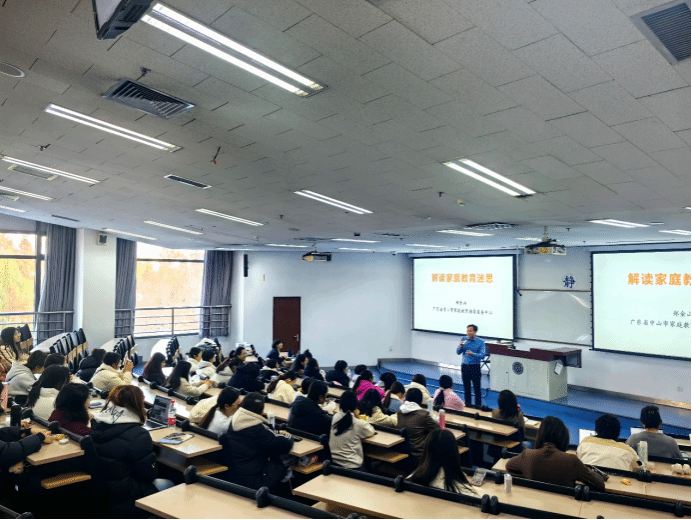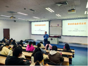 2024 年 11 月 18 日上午,中山市家庭教育指导服务中心郑金山主任走进家庭教育大师课,为师生们带来了《解读家庭教育迷思》的专题讲座,讲座由儿童发展与教学学院副院长房阳洋主持。