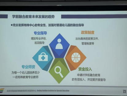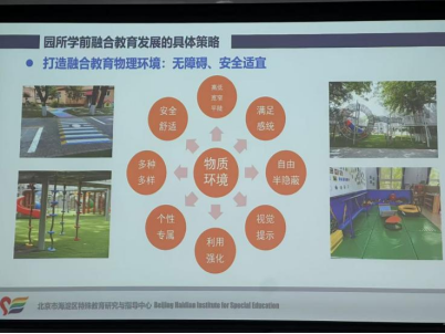 讲座中,王红霞主任回顾海淀区融合教育发展历程,指出该区从破解特殊幼儿入园难困境起步,通过打造无障碍物理环境与包容心理环境、构建多元安置支持体系、开发集体活动与干预课程并行的融合课程,同步推进师资培训与家园共育,形成系统化融合教育模式。