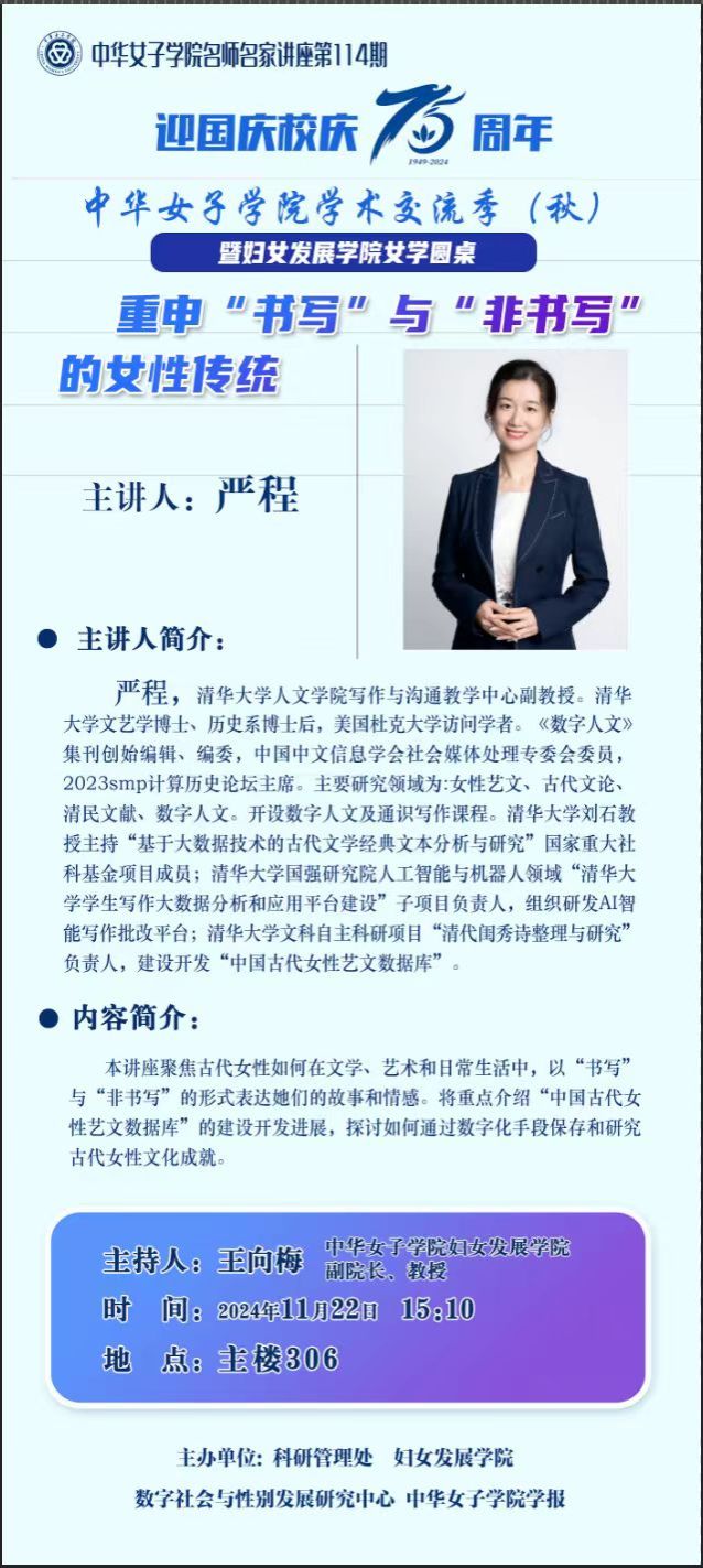 讲座预告:重申“书写“与“非书写”的女性传统——bwin必赢中国官网名师名家讲座暨妇女发展学院女学圆桌