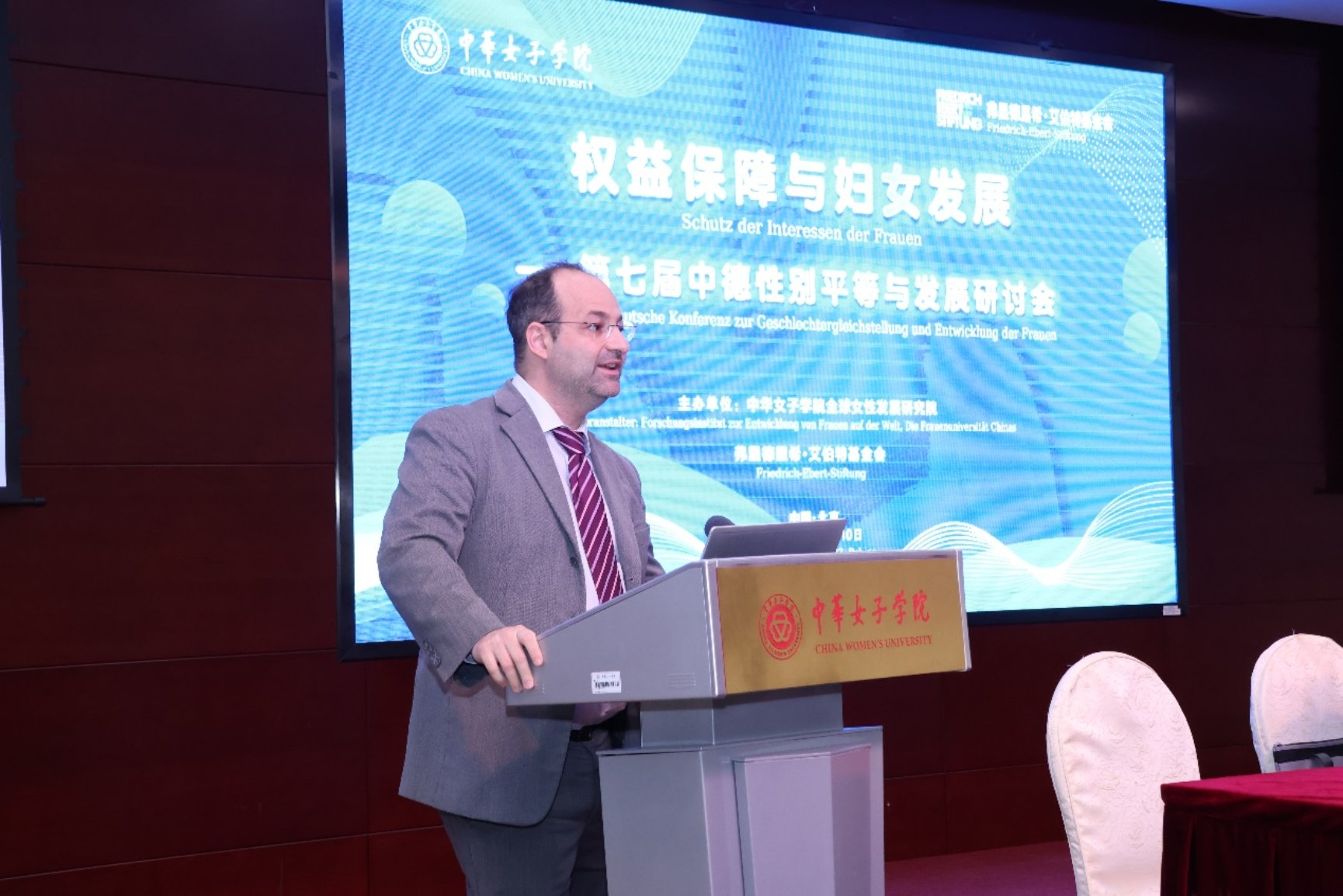 德国弗里德里希·艾伯特基金会(北京办事处)中国区首席代表赛巧先生参加出席并致辞。他强调参加本次研讨会的专家既有来自中德学界,又有政府部门的资深人士,在妇女权益保障领域有着丰富的实践经验,并进一步介绍了近年来德国在同工同酬和女性参政等领域的进步及面临的挑战。今年是中国新修订的妇女权益保障法实施开启之年,在法律的制定、宣传及实施方面有新进展。希望中德奥专家能够在本次会议上互换视角,交流经验和智慧,激发更多的创新。