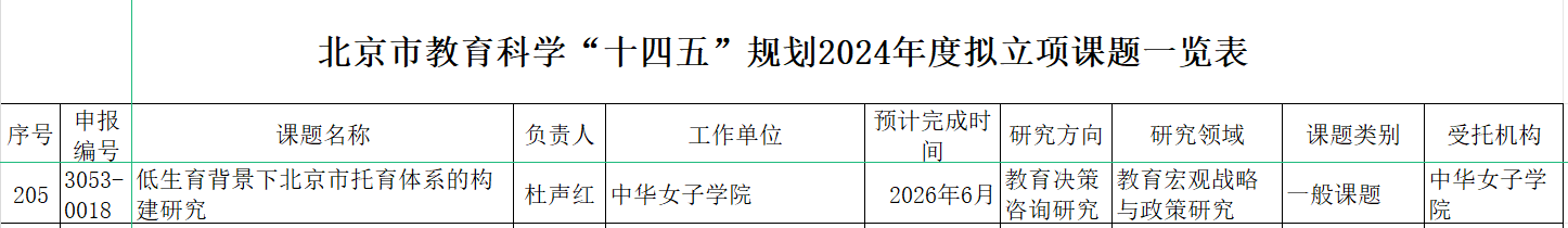 此前,我院教师杜声红已获批2024年度北京市教育科学“十四五”规划一般课题“低生育背景下北京市托育体系的构建研究”立项。该课题紧密契合当前社会关注的托育热点,深入贯彻北京市关于优化生育政策、促进人口长期均衡发展的战略部署,旨在通过实证研究为北京市构建科学、高效的托育服务体系提供坚实的数据支撑与理论参考,回应社会关切、服务地方发展。