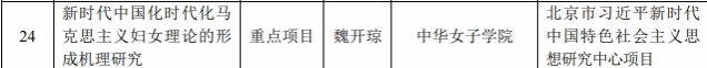 2024年11月22日,北京市社科联、北京市社科规划办发布了2024年北京市社会科学基金后期资助项目、北京市习近平新时代中国特色社会主义思想研究中心项目、决策咨询项目、规划项目的拟立项名单公示,妇女发展学院魏开琼教授的项目“新时代中国化时代化马克思主义妇女理论的形成机理研究”拟立项重点项目,杜声红老师的项目“北京市婚育支持政策实践与体系构建研究”拟立项一般项目。