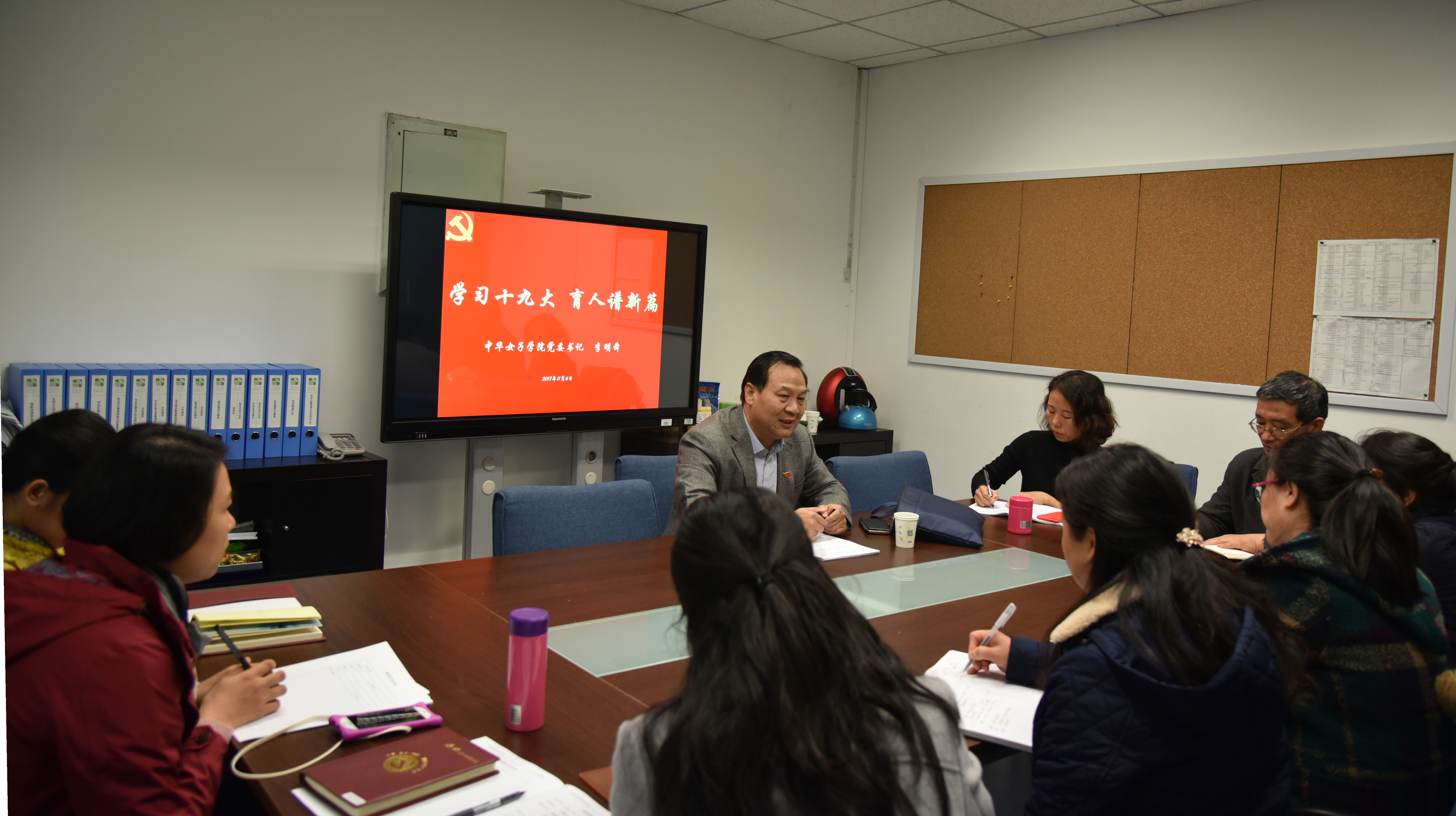 为全面学习宣传贯彻党的十九大精神,用习近平新时代中国特色社会主义思想武装头脑,2017116日下午,女性学系党总支邀请学校党委书记李明舜为女性学系教工党支部讲题为“学习十九大,育人谱新篇”专题党课。