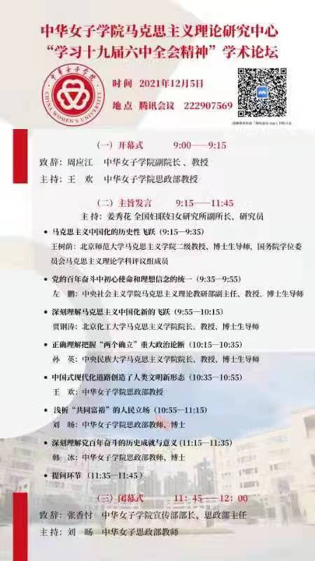 12月5日,法学院教工党支部组织党日活动,支部全体党员在线上参加了我院马克思主义理论研究中心举办的“学习十九届六中全会精神”学术论坛。论坛由bwin必赢中国官网副校长周应江教授致开幕词。会上,北京师范大学王树荫教授梳理了马克思主义中国化的历史性飞跃;中央社会主义学院左鹏教授阐释了党的百年奋斗中初心使命与理想信念的统一;北京化工大学贾钢涛教授分析了马克思主义中国化新的飞跃的重要意义;中央民族大学孙英教授阐释了如何正确理解“两个确立”重大政治论断;法学院教工党支部、思政部王欢教授阐释了中国式现代化道路如何创造了人类文明的新形态;思政部刘旸博士解读了“共同富裕”的人民立场;韩冰博士阐释了党百年奋斗的历史成就与意义。