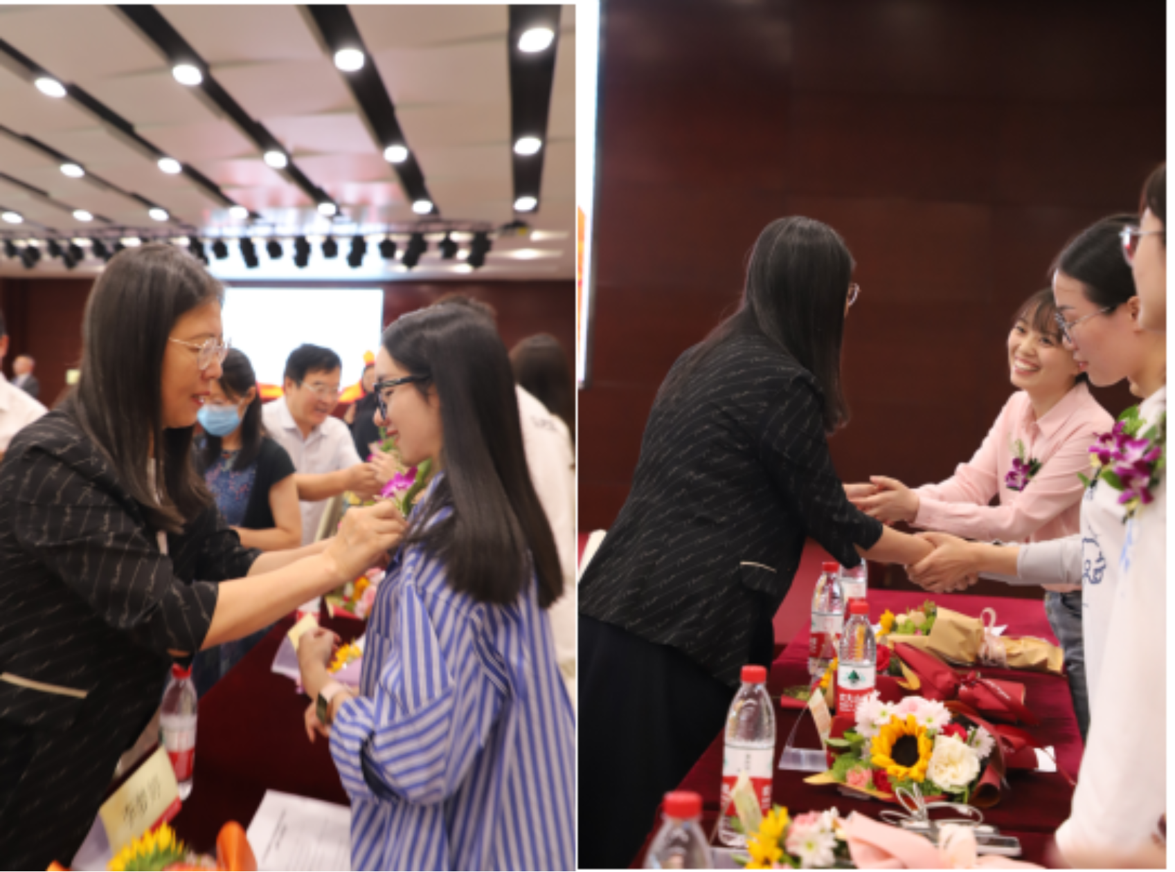 之后,校内外导师为新生佩戴了胸花,表示欢迎同学们的到来,共筑女院梦想!同学们给全体校内外导师献花,表达对老师们的敬意!