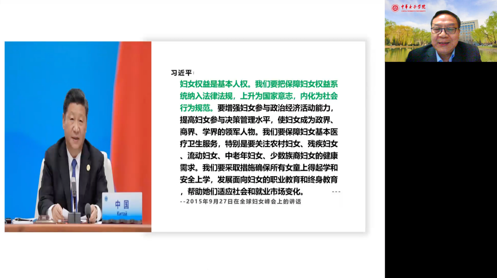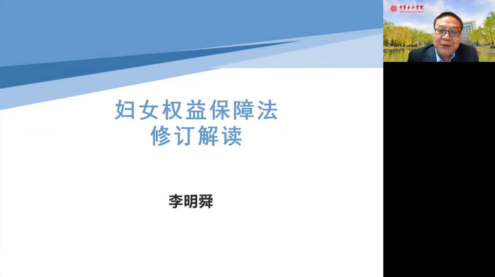 李明舜教授从修法的必要性、修法的指导思想和总体思路、本次修订的亮点及各章修订的重点四个方面,全面系统地对《妇女权益保障法》的修订作了解读。首先,李明舜教授从四个层次论证本次修订的必要性,即修订妇女权益保障法是贯彻落实党中央决策部署和习近平总书记重要论述精神的必然要求,是尊重和保障人权的集中体现,是促进妇女全面发展的有力支撑,是回应社会关切的现实需要。然后,李明舜教授指出本次修法以习近平新时代中国特色社会主义思想为指导,以坚持党的领导、全面总结经验、坚持问题导向、立足国情实际为总体思路。其次,李明舜教授讲解了本次修法的亮点:一是全面贯彻落实男女平等基本国策,不断丰富妇女权益保障制度内容;二是落实全面保障基础上,根据新时代妇女工作特点和妇女事业发展要求强化特殊保护;三是完善政府相关保障措施,强化妇女联合会的维护职责;四是倡导全社会尊重和关爱妇女,鼓励和支持妇女自强。最后,李明舜教授全面梳理了各章修订的重点,紧密结合必赢官网工作实际和教学实践对关键性条款和制度进行生动解读。