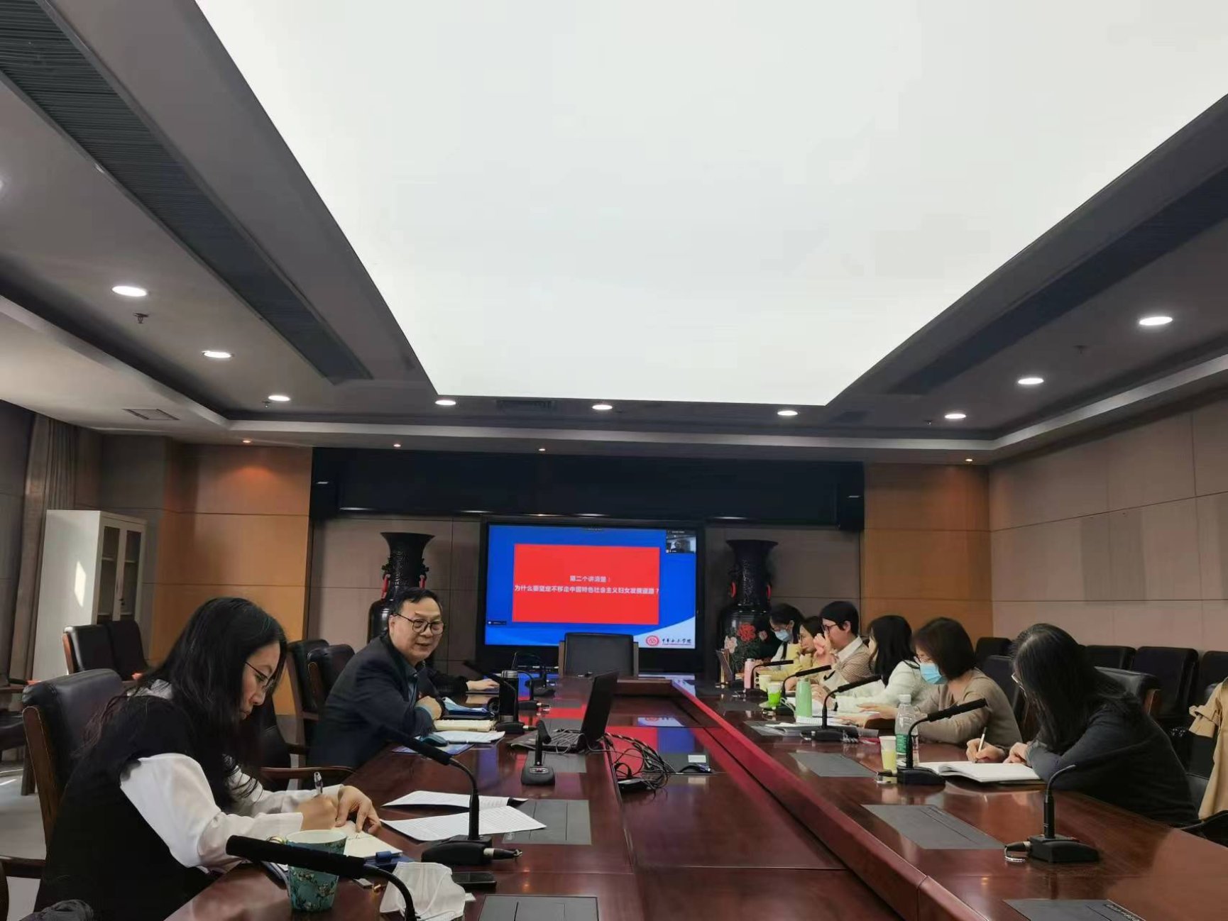 李明舜教授重点讲了两个问题,第一个问题是如何全面把握《意见》的重大意义、主要内容与核心要义。李明舜教授认为中办、国办印发《意见》意义十分重大,是新时代党和国家关于法学学科发展的纲领文件和行动计划,为新时代法学教育改革和法学理论研究提供了科学指引和基本遵循。其主要内容包括:坚持一个指导思想,明确提出两个阶段发展目标,确立五项工作原则,统筹部署法学院校、法学教育教学和法学理论研究三大体系建设工作任务。要充分认识《意见》的核心要义就是要用习近平法治思想铸魂育人,要筑牢中国特色社会主义法治信仰体系,要坚定不移走中国特色社会主义法治道路,要做社会主义法治的忠实崇尚者、自觉遵守者、坚定捍卫者。第二个问题是妇女权益法律保障课程如何落实《意见》的几个重点问题。李明舜教授认为重在“五个讲清楚”:一是要讲清楚妇女权益保障工作为什么要坚持中国共产党的领导;二是要讲清楚为什么要坚定不移走中国特色社会主义妇女发展道路;三是要讲清楚为什么必须坚持马克思主义妇女观的指导地位;四是要讲清楚男女平等基本国策与社会性别主流化有什么联系和区别;五是要讲清楚坚持男女平等为什么必须反对性别对立。两位与谈人高度评价李明舜教授的发言,认为讲座旗帜鲜明、高屋建瓴、内容丰富、针对性强,对今后做好法学教育与法学理论中男女平等问题的研究工作大有裨益,同时结合自身实际工作谈了对《意见》的理解和认识。海北州人民检察院与法学院已经在聘请学生为检察官助理等方面落实了《意见》要求,未来将继续在《意见》的指导下紧密合作,共同加强法学教育和法学理论研究。