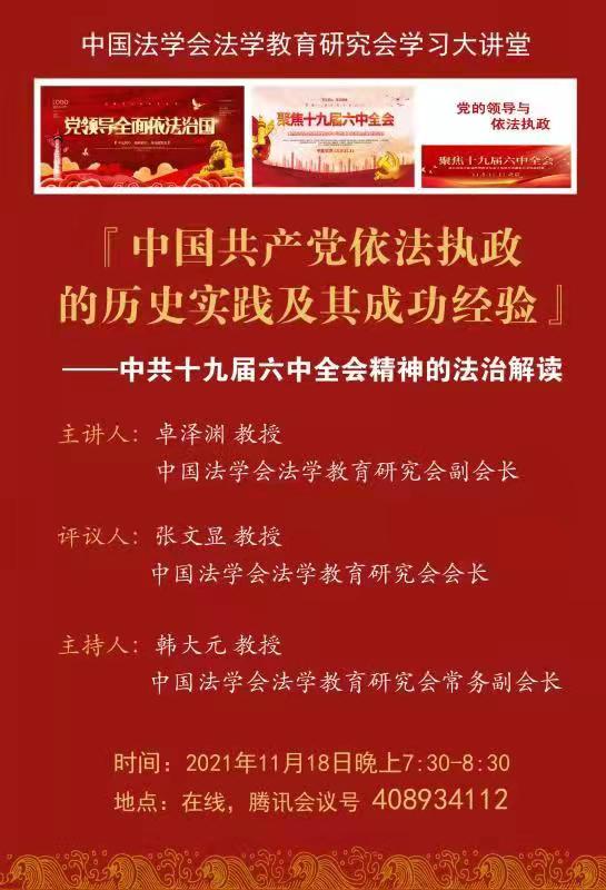 11月18日,法学院教工党支部全体党员在线上聆听学习了中国法学会教育研究会副会长卓泽渊教授对中共十九届六中全会精神的法治解读。卓泽渊教授从区域根据地法制建设讲起,分阶段总结了中国共产党依法执政的历史实践及成功经验,重点介绍了习近平新时代中国特色社会主义思想包括习近平法治思想指导下的新时代依法执政的内容。