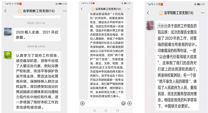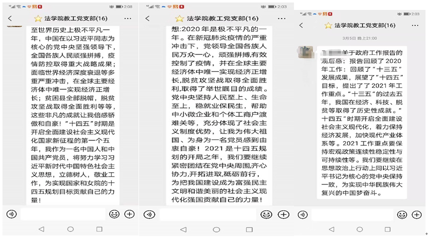 3月5日,法学院组织全体教工党员观看十三届全国人大四次会议开幕式,并认真学习《政府工作报告》。此次学习进一步激发了老师们的爱国情怀和民族自豪感,增强了责任感和使命感。大家纷纷表示,要紧密团结在以习近平同志为核心的党中央周围,坚持“两个维护”、“四个自信”,为建成富强、民主、文明、和谐、美国的社会主义现代化强国,为实现中华民族的伟大复兴努力;做好本职工作,坚持立德树人,为实现国家和女院的十四五规划目标贡献力量!