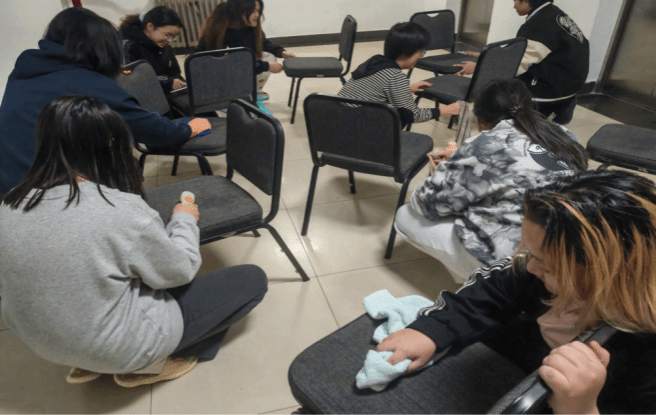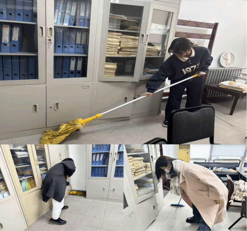 同学们满怀热忱,干劲十足。她们手持扫帚、抹布等各种清洁工具,仔细地清除会议室内的灰尘、污垢和垃圾,对会议室的椅子、桌子进行了仔细擦拭,确保每处卫生死角都能得到彻底的清洁。