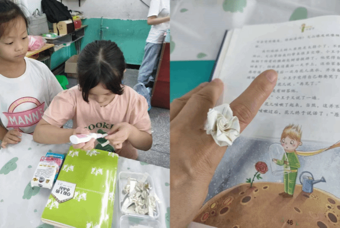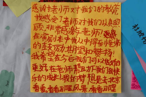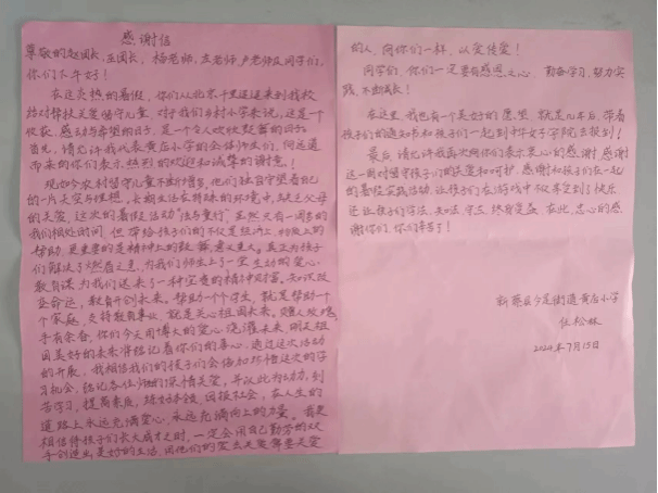 孩子们都真心地感谢小队师生七天来对他们的关心和呵护。三年级的张倩倩小朋友记着左玉迪老师讲的童话故事《小王子》,她用灵巧的小手折叠了九个漂亮的玫瑰花指环送给小队师生。任松林校长更是亲自手写感谢信,感谢女子学院师生千里迢迢从北京来到黄店小学结对帮扶、关心关爱留守儿童,他认为“法与童行”小队不仅给留守儿童上了一堂意义深刻的爱心教育课,更为他们送来了宝贵的精神财富。他鼓励孩子们长大成材、以爱传爱,几年后带着录取通知书去bwin必赢中国官网报到!