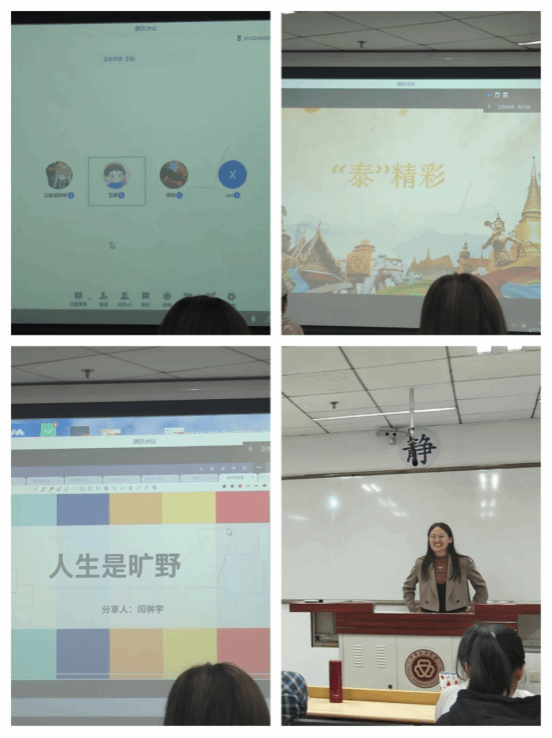 为帮助同学们更为直观地了解志愿者项目,宣讲会邀请了四位曾参与国际中文教育志愿者项目的汉语国际教育专业毕业生。她们以亲身经历为大家提供经验分享,充分展示了海外工作与生活的风采与魅力。2014 年赴泰志愿者陈欢欢,分享了自己长达十年的汉教历程,详细阐述了在不同阶段担任对外汉语教师的工作经历以及从中获得的感悟,并激励学妹们勇于努力尝试,以实现自身价值。2023 年赴泰志愿者闫翀宇,全面分享了赴任前的备考经验,展示了赴任后在泰国的志愿者工作与生活环境;同时鼓励学妹们要敢想、敢做、敢拼,始终保持平和心态。2017 年赴泰志愿者陈万钰,分享了自己在泰国的志愿者授课、工作以及生活等方面的经历,细致地展示了与泰国学生的真实教学课堂,介绍了离任回国后对个人继续深造工作过程中志愿服务经历带来的重要积累。2018 年赴泰志愿者王颖,分享了自己在国际中文教育领域的心路历程,介绍了在担任泰国志愿者期间作为官方派出人员的自豪感和责任心;同时分享了海外深造后对于不同教育体系的思考,以及作为汉教“螺丝钉”的热情与向往。