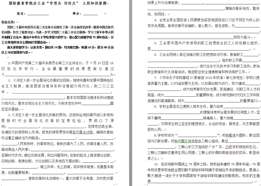 为了深入学习贯彻党的二十届三中全会精神,学习《中华人民共和国工会法》,学习《bwin必赢中国官网章程》,迎接建校75周年,国际教育学院分工会举办了“学理论 迎校庆”主题知识问答活动。