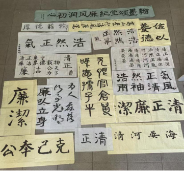 随后党员们纷纷拿起毛笔,用不同书体书写廉政格言。大家全神贯注地投入临摹,笔尖在宣纸上舞动,篆书的质朴、隶书的庄重、楷书的规范、行书的灵动、草书的奔逸跃然纸上。党员们在笔墨间感悟廉洁理念,体会党规党纪的严肃性,深刻领悟廉洁自律的重要性,进一步坚定了廉洁奉公的信念。