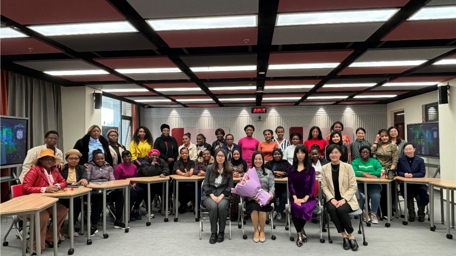 讲座结束后,留学生代表为凌友诗博士献上鲜花并合影留念。