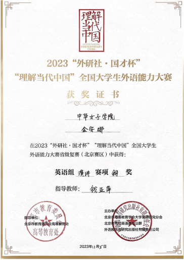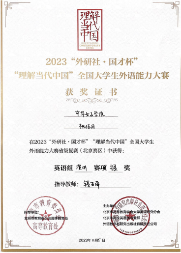 2023年10月28日至11月5日,2023“外研社 国才杯”“理解当代中国”全国大学生外语能力大赛英语组写作、阅读、笔译、口译、演讲赛项北京赛区比赛分别在北京印刷学院、北京外国语大学、北京林业大学举行,必赢官网派出12名选手参加了写作、阅读、笔译、演讲大赛。经过激烈角逐,由国际教育学院张娇老师指导的儿童发展与教育学院2021级学前教育专业本科生顾宸语同学和由钱亚萍老师指导的文化传播与艺术学院2022级播音与主持艺术专业本科生祝佳月同学斩获佳绩,分别喜获英语组笔译赛项、演讲赛项北京市银奖,其他10名同学获得英语组写作、阅读、笔译、演讲赛项北京市铜奖。