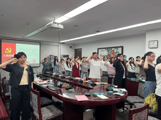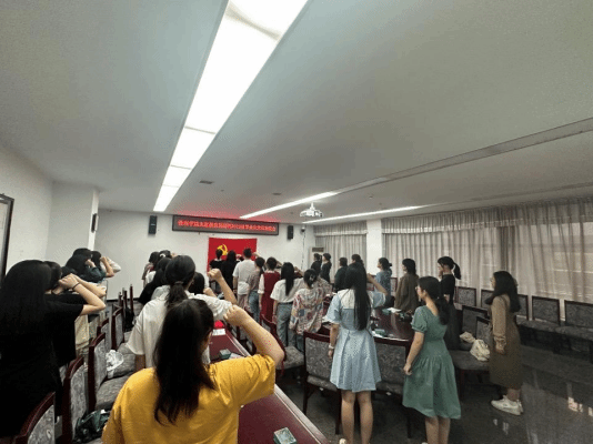会议伊始,张弦老师介绍 2023 届毕业生党员情况,总结了管理学院学生党支部的党建工作。各党小组就组内情况和组织生活进行回顾总结,激动与感动交融。在鲜红的党旗前,参会师生党员高举右手,高亢整齐、激情澎湃地许下“为共产主义奋斗终身”的铮铮誓言。