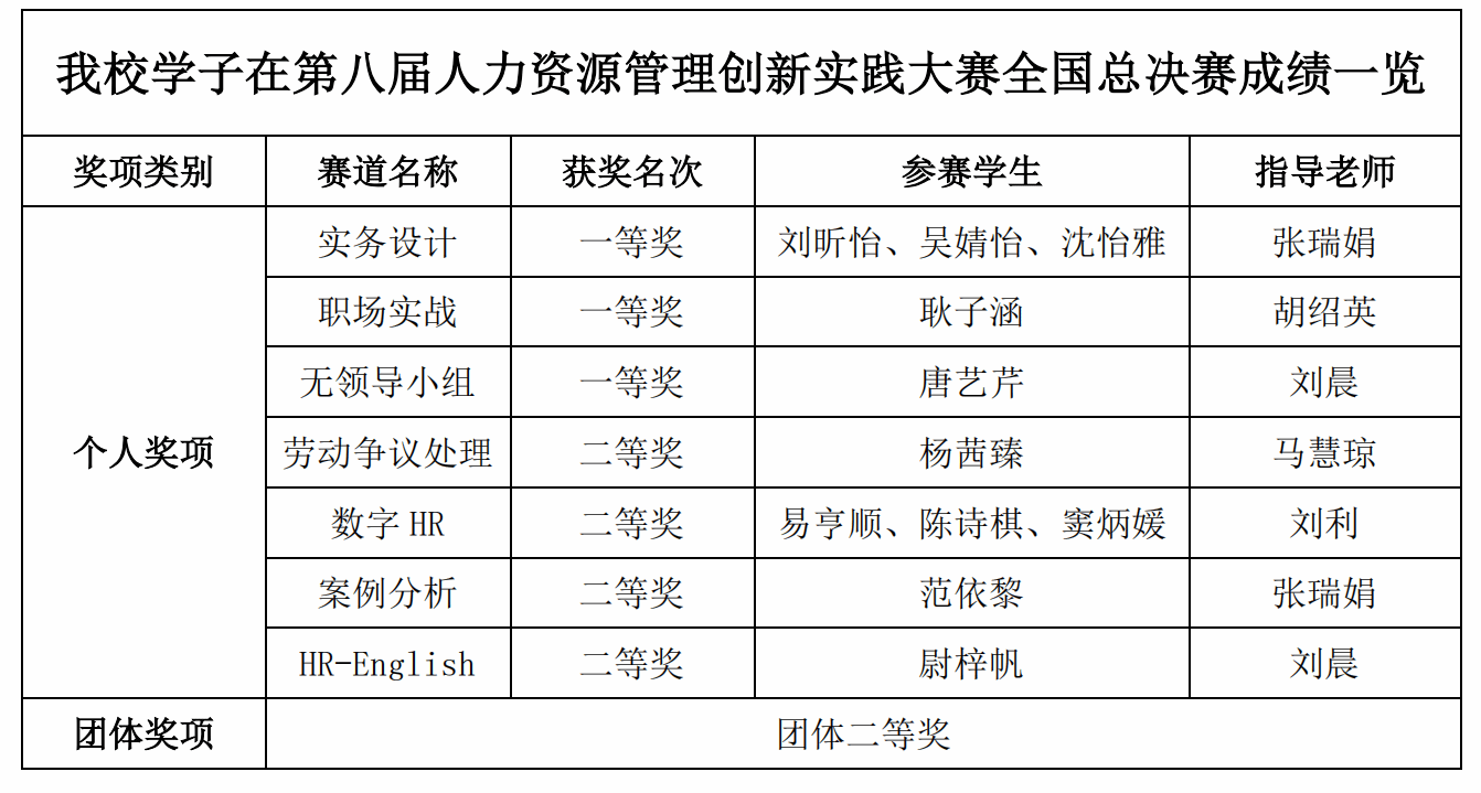 2023年11月26日,第八届中国大学生人力资源创新实践大赛全国总决赛在雄安新区圆满落幕!本次大赛以“立势、立才、立教”为主题,分为数字HR、实务设计、案例分析、无领导小组讨论、职场实战、劳动争议处理、HR-English七个赛道。在管理学院院长侯典牧和指导老师张瑞娟、胡绍英、刘晨、马慧琼、刘利带队下,管理学院人力资源管理专业共11名学生参赛。