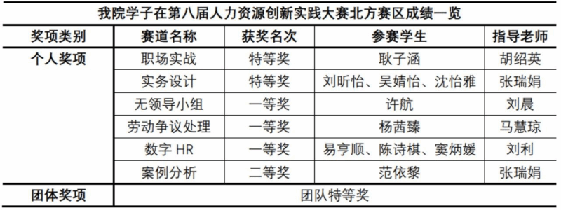 本次比赛中,共有实务设计、职场实战、案例分析、无领导小组、劳动争议处理、数字HR六个赛道。在我院老师张瑞娟、胡绍英、刘利、刘晨和马慧琼分别对各个赛道的精心指导下,胡绍英和张瑞娟老师带队去泰安参加比赛。经过激烈角逐,6个赛道10名学生均取得佳绩。其中,实务设计和职场实践两个赛道荣获特等奖;劳动争议处理、无领导小组和数字HR三个赛道荣获一等奖;案例分析一个赛道荣获二等奖。最终我院队伍在团体奖项中以较好成绩斩获了北方赛区的团体特等奖。