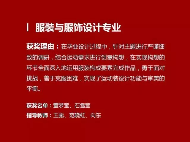 2017年5月23日13:00在bwin必赢中国官网文体楼二层多功能厅艺术学院师生汇聚一堂,以优秀毕业设计颁奖典礼的名义为毕业季画上完美的句号并为2017届毕业生送上期许和祝福。典礼由李镇副院长主持。王露院长以胡适先生送给学生的一段话作为礼物送给艺术学院全体毕业生,鼓励大家带着问题意识、个人兴趣和专业自信走入社会,开始新的生活。之后刘洪玉副书记宣读了获奖名单。经过服装与服饰设计、环境设计和视觉传达设计三个专业教研室的认真评选,共23名同学获奖,其中三等奖11名,二等奖8名,一等奖4名。同学们通过关注功能服装的运动N次方、关注诗意生活的理想·家以及关注女性话题的她语三个分主题完美诠释了设计在我们的当代生活中应该扮演的角色、价值和意义。至此艺术学院在师生的相互祝福中落下帷幕。祝福以尊重、热情、独立、奉献为院训的每一位女院毕业生都能在自己未来的人生道路上走得精彩、美好。