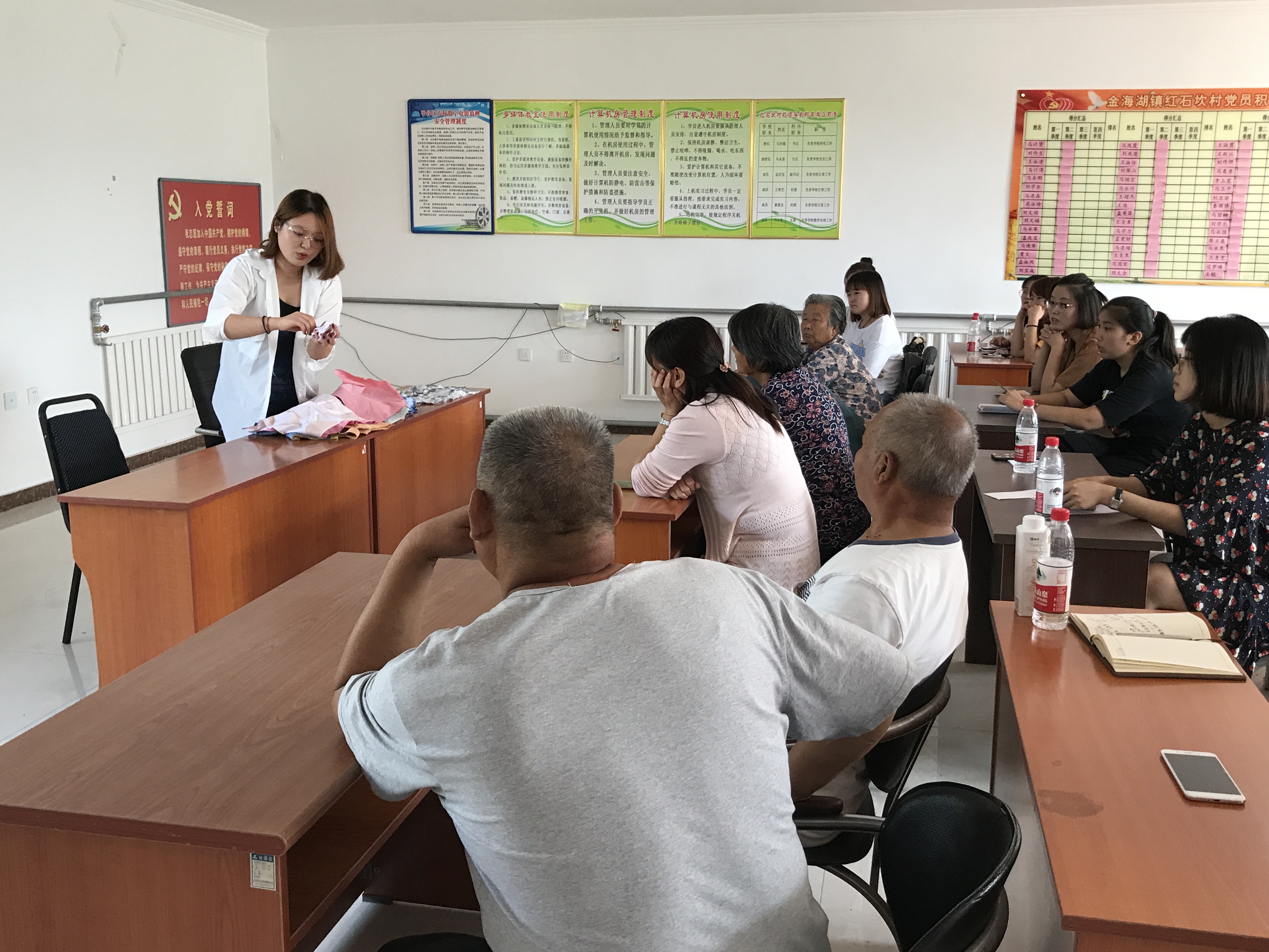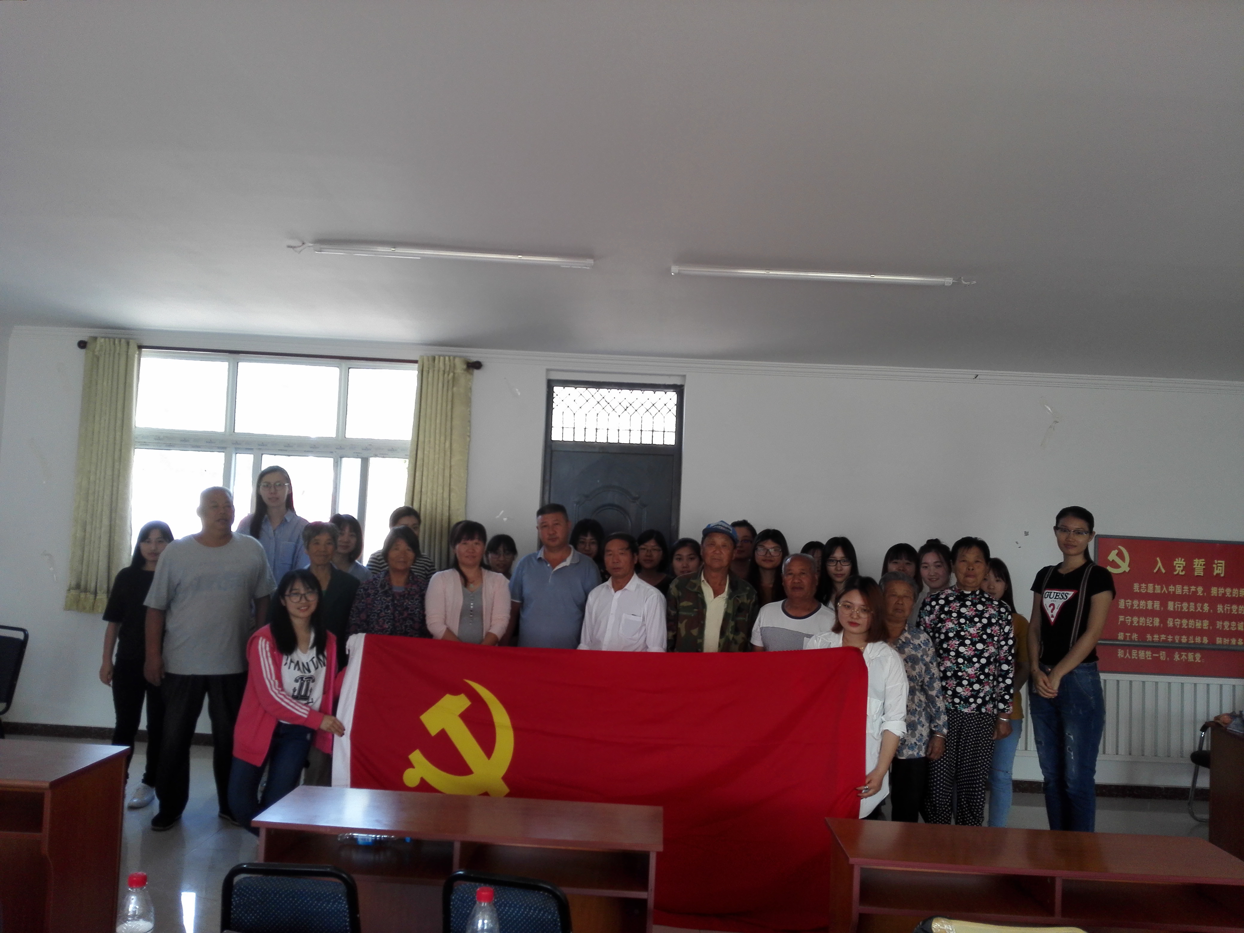 活动中同学们介绍了自己的学习的专业特色,并带去了自己的作品赠送给老人们,党员和积极分子与支书和村内老党员们进行了热烈的交流,了解了村里经济的发展情况,希望利用自己的专业技能为村里果品的开发进行产品包装设计,真正助力村民经济增收。