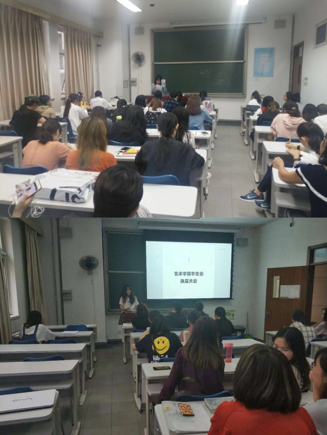 2018年9月19日艺术学院学生会换届大会于学校主楼135教室顺利举行。会议开始,学生会主席王璐总结了上一年的工作并期望新一届学生会成员再创辉煌。接着,学生会各部部长、副部长接受资格审查,对上届学生会的工作成果作出一定总结,本次学生会换届本着“公平、公正、透明、择优”的原则,致力于选出一批精干的优秀成员,望新一届学生会成员严格要求自己,勇于担当,把学生会的工作进一步落到实处。