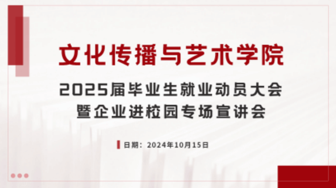 为助力2025届毕业生从容迎接就业挑战,提前进行科学合理的职业规划,10月15日文艺学院召开了2025届毕业生就业动员大会暨企业进校园专场宣讲会。就业指导中心主任程敏应邀参加,文艺学院党总支副书记刘洪玉、学生科及2025届全体毕业生参加了大会。