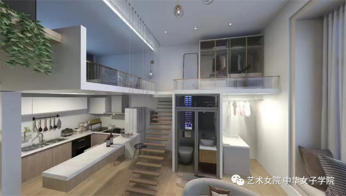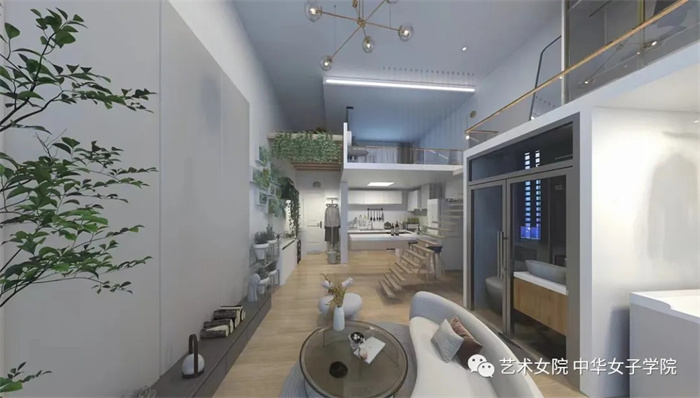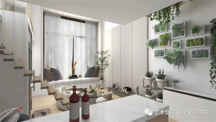 本案将绿植引入室内,通过设计将室内布置的更加绿色和自然,返璞归真,回归自然的设计理念。协调人与环境的关系。并强调垂直绿化在都市胶囊空间中,充分利用复式上空的布局特征。与此同时,设计选材上着重体现可持续应用的设计元素:新型生物塑料材料、再生材料,或是对环境影响小的环保建材等成为设计新宠。突出Z世代消费群的审美视角和价值观念。