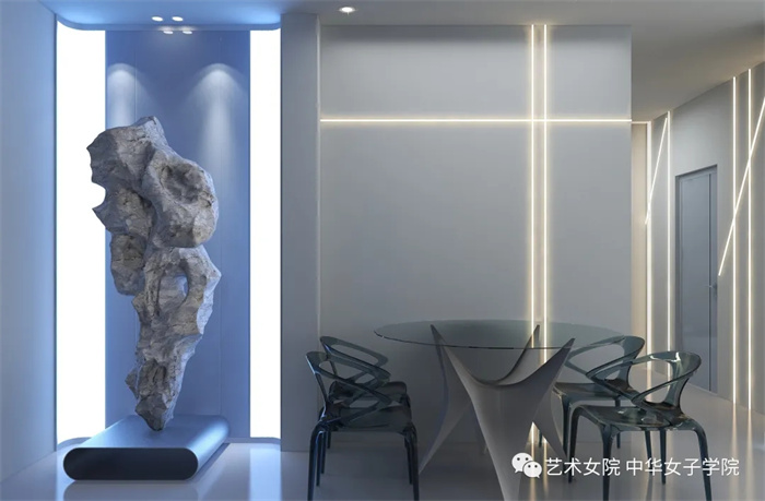 Z世代的家居融合了传统与未来、诗性与舒适。“我和你共享的是整片星空,形形色色的我们在街道中,在霓虹下,始终抬头便可共享星空。”空间整体色调以蓝色为主,在门厅处放置的太湖石,其形态配合灯光可以更好的营造氛围及呼应主题。家具和装饰品多为环抱形状,体现出双方共享星空时的密切距离和温暖。