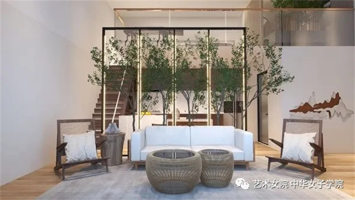 《从百草园到三味书屋》是鲁迅先生的一篇回忆性散文,这篇散文正是我的灵感来源。在全文最后一句,暗示了作者的童真童趣的一去不复返。但我反而想留住这一份颇具童趣的回忆,于是在室内运用大量木制家具,意在营造出身处自然的氛围感,仿佛身处有着高大皂荚树、碧绿菜畦的百草园。客厅和卧室藤编的茶几、衣柜让人不禁联想到冬天在百草园捕鸟的有趣场景。二楼卧室的墙面上的枯山水装置与冬天百草园的雪景相呼应。