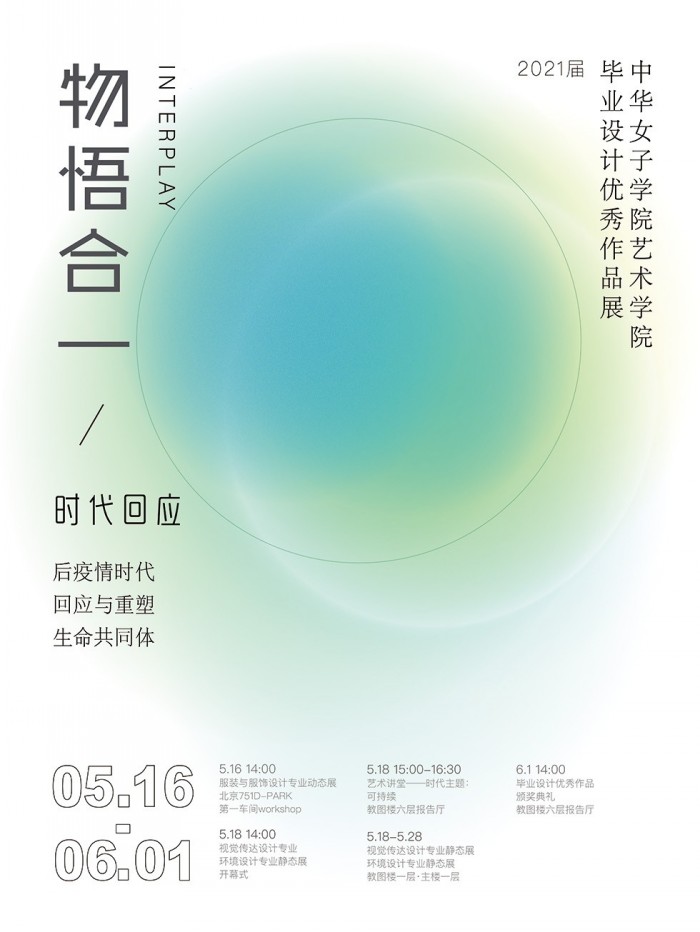 2020的特殊之年,我们只能在艺术学院的云展厅相见,今年在艺术学院毕业设计展的第13个年头,云展厅、服装秀场和实体展厅都展示了学生们成长的痕迹与创意的闪光点。2021年,党的百岁华诞之年,国家的十四五开局之年,我们一起面对着百年未有之大变局,迎来了Z时代的毕业之年,时代在向我们提问,设计的内涵发生了什么样的变化?回应时代变革设计应如何发挥自身的作用与价值?艺术与科学,时尚与健康,包容与可持续是艺术学院在学科建设和人才培养的探索中一直坚持的方向。通过三个专业师生们共同的精心打磨,学生们用作品回应了今年的展览的总主题“物悟合一:时代回应”。