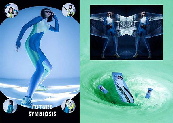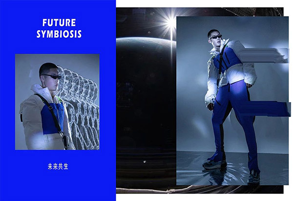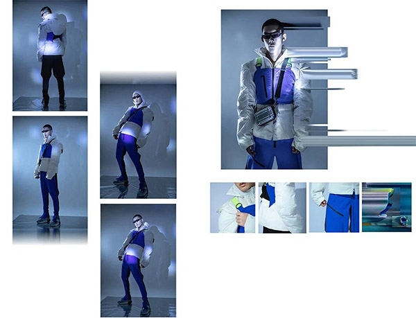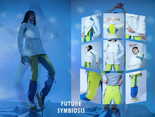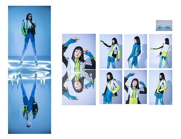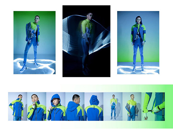 以“全球气候变暖带来的环境变化状态”作为灵感来源,冰川融化的形态、冰河时代被冰冻的状态,以“未来共生Future symbiosis”为主题,虚实之间,试图与未来世界进行一次超现实的服装对话,融合现代科技和自然力量,探讨服装与人与环境之间该如何平衡相处,演绎不同材质、表面、形态,创造激进、硬核、可持续、呈现未来感格调的越野滑雪相关运动服装。颜色聚焦数字风,以性能蓝、生物青柠和光学白为主旋律,面料技采用创新考究面料,适应不同天气环境。